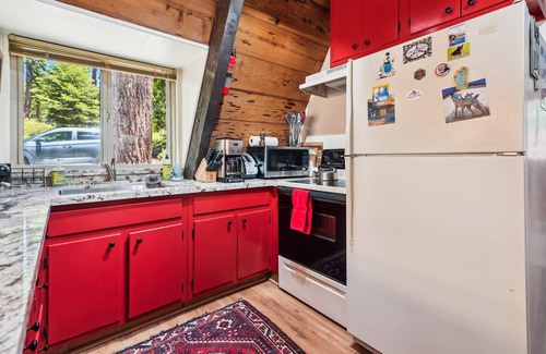 Adventures of the A-Frame" is your ultimate dog-friendly mountain escape in North Tahoe, nestled on a private road surrounded by 400 square miles of pristine forest. Step into this adorable A-frame Cabin with its newly decorated 60s-inspired furnishings, creating a Mad-Men-stylized ambiance. Enjoy the cozy wood stove, well-equipped kitchen, and sun-drenched front and back porches shaded by majestic pine trees. With its prime location between Tahoe City and Tahoe Vista, near the stunning shores of Carnelian Bay, endless adventures await right outside your door.