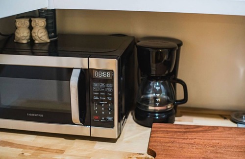 After a day of adventures, return to your comfortable haven complete with a luxurious full bathroom featuring beautiful tiled shower with a soothing rain down shower head, ensuring a relaxing and refreshing experience. We've thoughtfully designed this space with your comfort in mind. A thoughtfully arranged Kitchenette provides all the basics to make your stay comfortable and convenient. The outdoor courtyard and green space complete with shaded picnic tables offers the perfect opportunity for some fresh air or outdoor dining.