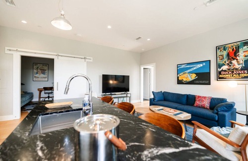 Experience all historic Martindale has to offer at the Western 24 Luxury Lofts. Located on the second floor of the fully restored Martindale Motor Company building, this 2-bedroom | 2-bath vacation rental offers a stylish stay in a Texas Registered Landmark. Amenities include an office, private balcony, full kitchen and even a washer/dryer. Come explore the charm of our authentic community, where you can shop, enjoy a craft cocktail, dine and experience great live music just steps away.