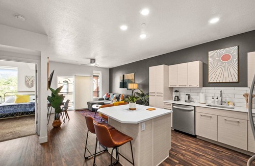 Experience luxury in our spacious apartment located in the heart of SLC. Enjoy stunning mountain views from the open floor plan and modern bohemian decor of the spacious living area with a large flat-screen TV. The fully equipped kitchen and en-suite bathroom with a luxurious shower make your stay comfortable. The central location puts you just steps away from restaurants, bars, entertainment venues, university, hospitals and convention centers. Book now and enjoy the best of Salt Lake City.
