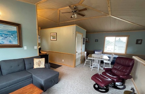 The apartment is located above the homeowner's shop and small living quarters. The entrance is quaint, board and bat and corrugated metal siding. Head up the carpeted stairs into the main living area. The small dinning room table seats four people and the windows lend views to upper Paradise Valley and Emigrant Peak (thru the trees). The living area also hosts a small couch, coffee table, and flat screen TV.