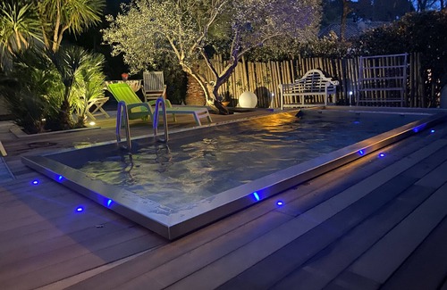 Villa of full foot 120m2 entirely air-conditioned, with outdoor spa at 37 degrees all the year, terrace with outdoor living room full west sunny sunny garden of 130 m2 exotic wood in the heart of the golf biscarrosse and close lake, ocean, and beach