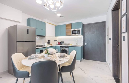 The open-plan dining and sitting area features a TV, perfect for relaxing after a day at Ski Dubai or shopping at Mall of the Emirates. The kitchen includes a washing machine for your convenience, and we provide hotel-grade bed linen and towels, along with initial toiletries like shampoo and soaps to ensure a seamless arrival.