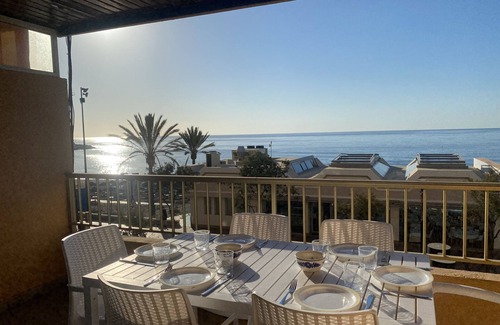 The flat has a very spacious terrace with garden furniture to enjoy a beautiful panoramic view of the sea, the beach, the promenade and the port of Fuengirola. On the terrace you can enjoy a delicious breakfast under the sun overlooking the sea. On the beach in front of the flat there are several beach bars, here you can also rent sun beds and umbrellas. The flat is situated on the first floor (with lift). Walking distance to many restaurants, bars, shops, supermarkets, the marina, bus and train station. Only 5 minutes walking distance from the flat is the constitution square.) Also within walking distance are the Fuengirola Zoo, Mijas Costa's Aqua Park and the Miramar shopping centre. If you are looking for a spacious flat on the beach and close to everything, this is your ideal holiday home.
