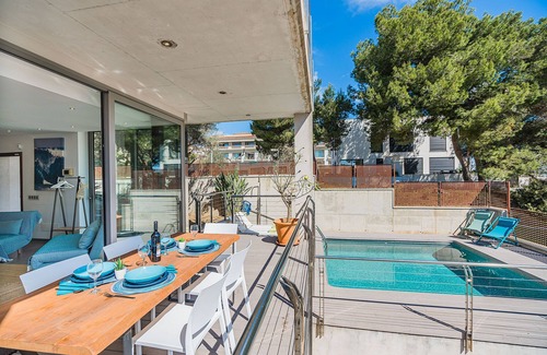 This modern spacious house is ideally situated 100 metres from the white sandy beach of Playa de Muro. Set in a quiet location with sea views this house has everything to offer its clients for a relaxing holiday. There is a spacious modern living dining room with large patio doors leading out to a furnished terrace overlooking the pool. The house also has WiFi connection. The kitchen is also very modern and well equipped with dishwasher, washing machine, fridge freezer, electric oven and hob, toaster, microwave and coffee machine. There is also a shower room on this floor. Upstairs there is one doble and one twin bedroom with fitted wardrobes and an impressive master bedroom. This master bedroom has an open plan feel with a feature round bath (bath function only), separate shower and toilet. There bedroom also has a lovely terrace with sea views and sun lounges too. There is also another separate bathroom with shower over bath on this level. There is air conditioning only in the bedrooms from 17h - 8 hours. Outside there is a dining terrace and swimming pool which is gated and has a decked sunbathing area. There is also a garden with swings for children.Tourist License Number: ETV/13421