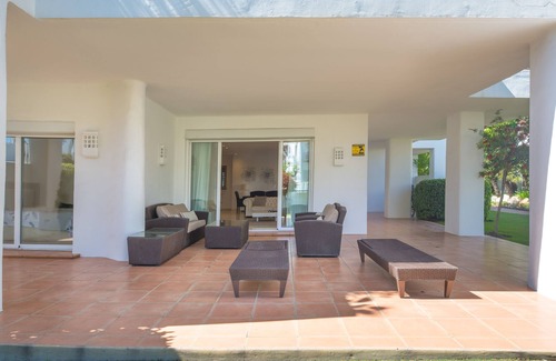 3 bedroom, 3 bathroom ground floor vacation apartment with a large south facing terrace overlooking located in this exclusive beachfront urbanisation set in tropical gardens with with security, pools, tennis courts, gym, restaurant + free Wi-Fi and TV channels provided by the Urbanisation Management. This home is fully-equipped for your comfort away from home. You will find shops and bars within walking distance and supermarkets and restaurants are a mare five minutes by car.