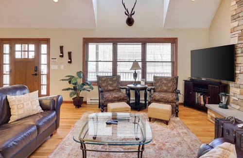 Alex and Marie’s Manor is a spacious & luxurious 3 story, 4 bed - 3 full bath Cape Cod with hardwood floors throughout the entire home, a furnished screened in porch with propane fire table and walking distance to main Pool/Beach! Master bedroom has a king bed, jacuzzi style tub, private master bath & access to private upper back deck. The main floor’s flowing open concept provides more than enough space for the entire family. Living room with large leather sectional, NEST thermostat controlled central AC/Heat, floor to ceiling propane fireplace, ultra modern kitchen with granite counter tops, stainless steel GE profile appliances, eat in kitchen, separate dining area which seats 8-10 (optional leaf for the table) and plenty of natural light with large windows on all sides of the home. 2 queen bedrooms with zoned split unit AC/Heat are also located on the main floor with one of the bedrooms giving direct access to the back deck via sliding glass door. Lower level family TV/game room with Foosball table, Wii console and games, mini fridge & wet bar also has its own bedroom and full bathroom with washer and dryer. There is also an additional eating area on the back deck with propane grill hard wired to the homes propane tank. Upper level over sized loft also gives extra space for entertainment. Make your Pocono mountain retreat a time to remember at Alex and Marie’s Manor!
