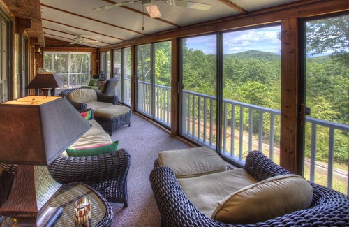 Welcome to All About The Views! Located on the summit of Irwin Mountain, this beautiful mountain retreat features amazing views of Tray, Chimney and several other northern mountain ranges making for one of the longest tiered and deeply layered vistas in the area, changing throughout the day and culminating in stunning sunsets - a perfect time to relax in the hot tub or gather around the fire pit! In this setting far from city lights and light pollution, All About the Views is the perfect location for stargazing, yet is still convenient to Helen, Sautee, Batesville and Lake Burton, and just 2 miles to The Old Sautee Store, Sweetwater Coffee House, or Bernie's Restaurant - all local favorites! This 5 bedroom is equipped with 4 Kings and 1 Queen to accommodate a maximum head count of 10, with screened porches surrounding the home offering a variety of places to gather or escape for some quiet time... the Master bedroom upstairs has its own private deck with seating just for two!