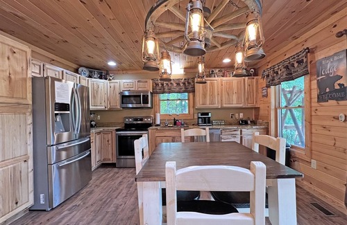 This lovely cabin sits nestled back in the trees, just five minutes from the Almond Boat dock put in on Fontana Lake, so make sure to bring your kayaks, paddle boards, or fishing poles. Take relaxation even a little further with the hot tub, fire pit area, or simply by enjoying your morning coffee on the covered porch, Almond Joy is just the spot you've been looking for.
