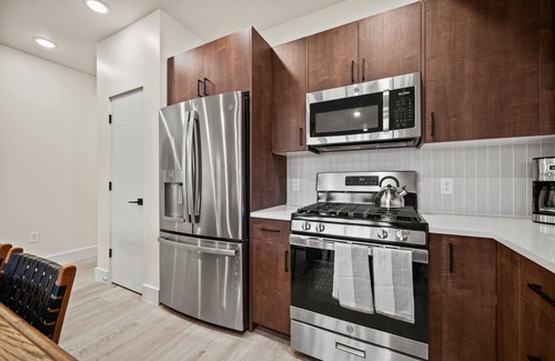The living area invites relaxation with its warm ambiance, electric fireplace, and large Roku TV, ideal for cozy evenings. Stunning mountain views fill the living room, adding natural beauty to your stay. The couch is a sofa bed allowing two additional guests. The well-equipped kitchen provides everything you need, from a dedicated coffee station and a refrigerator with an ice maker to essential appliances like a microwave and toaster. Cooking is a joy with the fully stocked kitchen, including a gas stove, spacious fridge with icemaker, pots, pans, a coffee maker, kettle, blender, crockpot, bakeware, and dinnerware for six. Enjoy your meals at the dining table, which comfortably seats up to six.