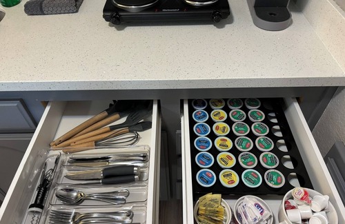 * Refrigerator, cook top, toaster oven, microwave, Keurig coffee maker, coffee, filtered water