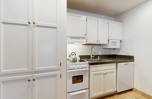 Overlooking the pool at the Lodge, your deluxe studio boasts a fireplace and a full kitchen that is well-equipped for prepping your favorite recipes. Plus, there’s a kitchen bar and two-seat dining table for mealtime, board games, and puzzles. Step out on the furnished balcony with a view of the pool for a breath of fresh mountain air anytime.
