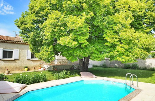 This single-storey villa, newly renovated and centrally located in Mouriès, offers a pleasant stay with a private pool in the garden. The villa's garden is within walking distance of all stores and is adorned by a lime tree planted by the owner's great-grandfathers, providing refreshing shade. The villa has an open plan kitchen next to the living area which is equipped with modern appliances. The living/dining area has a decorative fireplace, a dining table with chairs and comfortable sofas to relax on. The bedrooms sleep six people and have a shared shower room and separate toilet. Outside, a covered terrace by the pool offers an inviting space with seating and a handy American fridge. There are two sun loungers and large stools by the pool. The private pool (6m x 4m, 1.6m deep) is accessible via a ladder. Please note: The villa is conveniently located close to stores and two air conditioning units in the hallways ensure a pleasant indoor climate. As part of the fence is low, only small dogs are allowed. Cats are not allowed for allergy reasons. Parking is available on the public highway. The villa is located in the center of the village of Mouriès in the Alpilles. All stores are within walking distance.
