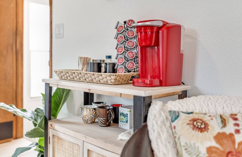 The kitchen offers brand new appliances with a gas stove, quartz countertops, undercabinet motion sensor lights, and all your cooking appliance needs for a small group. And, we have plenty of kitchen extras! K-cups and more at the full coffee station, a welcome basket on the counter, a few items in the fridge such as bottled water, a water cooler, and a snack drawer!