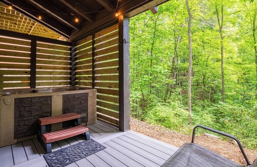 The two bedrooms feature king-size beds, both with full baths, allowing plenty of space for couples or families to share. There's a queen-size sofa bed in the living room and twin bunk beds in the game room. Eight people can sleep comfortably at Firefly Hollow. There are large screen TV's in rooms to let everyone watch their favorite shows. On the bottom porch , there's a large private Hot Tub, surrounded by romantic lighting and secluded with private screens and curtains. In the front, a large fire pit for roasting hot dogs or everyone's favorite - Smores' - Please enjoy your FREE Smores' kit provided with each stay. Plenty of seating to enjoy the coziness of the fire or just to relax with a good book on a chilly Smokey Mountain day.