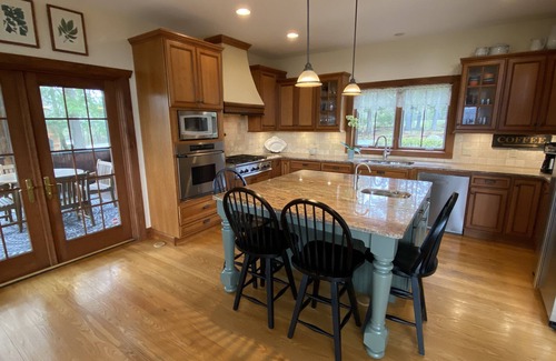 Our custom built home has 4 bedrooms (1 K, 1 Q, 1 Q, 1 Q+ 1T) with 2 full bathrooms, and 2 additional 1/2 bathrooms. Open floor plan with a stunning 2 story great room with natural stone wood burning fireplace and 65" Smart TV (w/Roku and access to your Hulu, Netflix, etc), Internet and WIFI, dining room, screened porch, and large deck with gas grill.