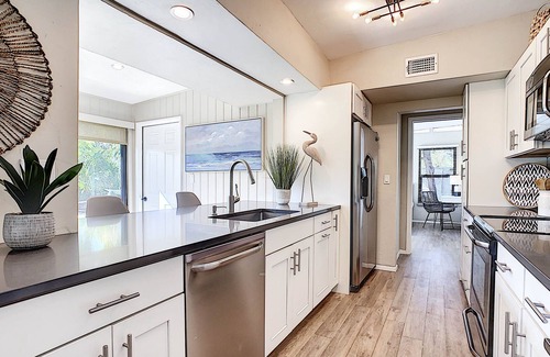 All-new, high-end quartz counters, stainless appliances, stylish leather chairs, Keurig, and gourmet pots and pans. Rolling bar cart and utensils are a great way to display your favorite spirits and celebrate the Siesta Key lifestyle.
