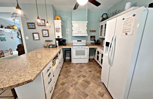 For beach lovers, white sand beaches and turquoise waters are just 6.6 miles away, offering the perfect opportunity to soak up the sun and play in the waves. Water and fishing enthusiasts can launch the provided kayaks from the private dock in the backyard, exploring the winding creek at their leisure.