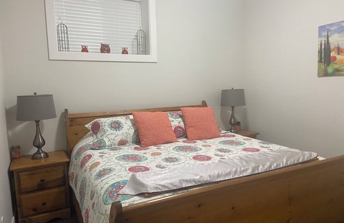 This 2-bedroom suite includes a king bedroom and a queen bedroom, as well as a patio and a separate entrance. The rooms are not shared spaces; the entire suite is yours to enjoy alone. The area is private, peaceful, and quiet, allowing you to relax and unwind. You can take in stunning, unobstructed panoramic views of the valley and the mountains, including Mount Baker.