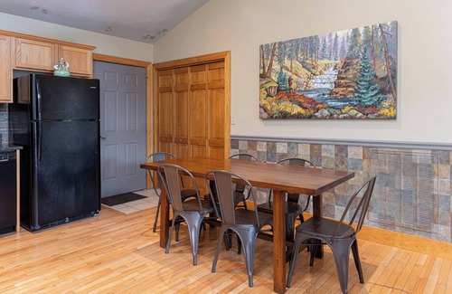 Inside, you’ll find a cozy living room with a gas fireplace, perfect to curl up near on chilly evenings or while enjoying movie night through satellite streaming options on the TV. A fully-equipped kitchen and a large dining table make-at-home meals and snacks a breeze, while three bedrooms give everyone in your group plenty of space to spread out.