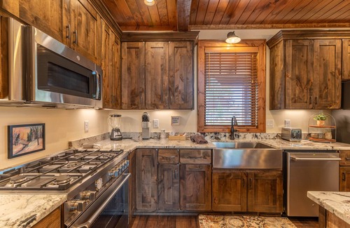 The beautiful, new kitchen opens to the living area with deck access. The gas fireplace and large TV have several chairs and a sofa. The two suites are on either side of the living room. The King suite to the right has a TV and a fabulous bathroom. The bathroom has a large, tiled shower, and the double vanity with a granite counter top. The King suite on the left has the same great views, with a tiled tub/shower combination, and a granite double vanity.