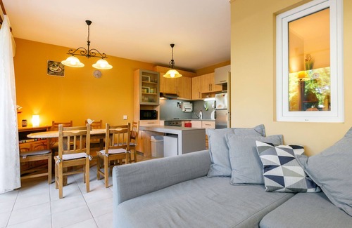 "Andreas", 3-room apartment 55 m2, on the ground floor, east facing position. Object suitable for 4 adults + 1 child. Comfortable and cosy furnishings: open living/dining room with dining table, cable TV, international TV channels, flat screen and air conditioning. Exit to the balcony. 1 double bedroom with 1 french bed (160 cm, length 200 cm). 1 small room with 1 bunk beds (80 cm, length 200 cm), 1 french bed (140 cm, length 200 cm). Open kitchen (oven, 4 ceramic glass hob hotplates, toaster, kettle, microwave, freezer, electric coffee machine). Shower/WC. No heating option. Balcony furniture, covered balcony. Facilities: washing machine, iron, children's high chair, baby cot (extra), hair dryer. Internet (WiFi). Parking. 1 small pet/ dog allowed.