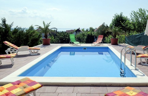 Balatonalmádi 16 km from Balatonfüred: Beautiful single-family house "Annemarie". 2 km from the centre of Balatonalmadi, on the outskirts, 7 km from the centre of Balatonfüzfö, 17 km from the centre of Balatonfüred, on a slope, in the residential district, 2.4 km from the lake, 2.8 km from the beach. Private: property 800 m2 (fenced) with trees, meadow, swimming pool heated (6 x 4 m, depth 120 cm, seasonal availability: 15.May. - 30.Sep.). Children's playground (slide). In the house: table football. 200 m long bumpy motor access. Stepped path to the house. Parking (for 3 cars) on the premises. Grocery 1 km, supermarket 2 km, grass beach 2.4 km, thermal baths "Pápai Thermal Bath" 62 km. Tennis 2 km, riding stable 2 km, cycle lane 2 km, children's playground 2 km. Nearby attractions: BalatoniBob Theme Park 5 km, Veszprém Zoo 15 km, Balatonfüred Annagora Aquapark 18 km, Tihany 24 km, Balaton Theme Park Nosztori 18 km, Koloska Valley 18 km.