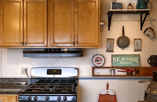 Downstairs, the kitchen has a 5-top gas stove, oven, toaster, microwave, refrigerator/freezer, and dishwasher, as well as a double sink (please note that there is no garbage disposal). There’s also a table with seating for 6. Adjacent to the kitchen, you’ll find a salon with another 6-top table, sofa, gas fireplace, and the historic wooden “Annie’s Jughandle” sign for a cozy photo opp. There’s also a collection of games and a classic stereo system.