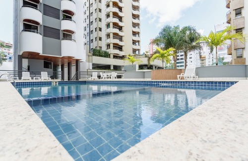 Condomínio com academia, piscina e áreas comuns bem decoradas.