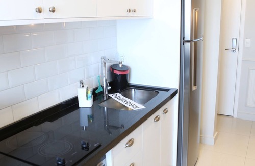Cozinha completa com Geladeira, Fogão e Forno Elétrico, Forno de Micro-ondas, Air Fryer, Pratos, Talheres, Panelas, Liquidificador, Cafeteira Elétrica.