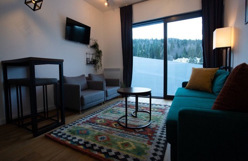 Elegantno opremljeni enterijer koji će vas očarati svojom udobnošću s prekrasnim pogledom na planinu. Apartman sa 1 sofom i dvije fotelje na razvlačenje, kupatilom i opremljenom kuhinjom. U apartmanu mogu boraviti do 4 osobe.