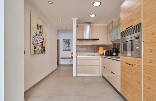 Atmospheric living room with open kitchen and sea view. Sitting area with sofa, TV with international channels, sports and film, fiber optic internet, air conditioning and a dining area for 4 people. Sliding doors to the spacious terrace with beautiful views over Playa Burriana and the Mediterranean Sea. On occasion, you can see schools of dolphins passing by.