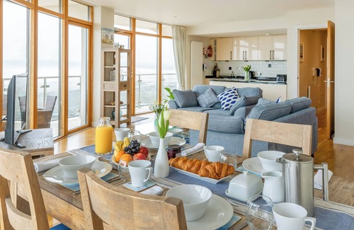 Shower Room: Cubicle Shower, Heated Towel Rail, Toilet. Heating, electricity, bed linen, towels and fibre broadband included. Large balcony with outdoor furniture. Underground car park, allocated for 1 car which is situated at the end of the car park (with lift access to ground floor). No smoking.. Step inside 22 Horizon View and you’ll be swept away by breathtakingly beautiful views, striking architecture and a property which will make you want to visit again and again. Number 22 is a stylish, two bedroom, first floor apartment in the landmark building of Horizon View; an architectural statement placed directly on the seafront of Golden Bay beach at Westward Ho!