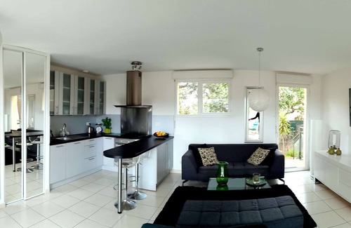 The apartment offers a large main living room with a fully equipped kitchen, a nice TV lounge, a dining room table. All opening directly on a large terrace south oriented on one side and a small garden on the other.