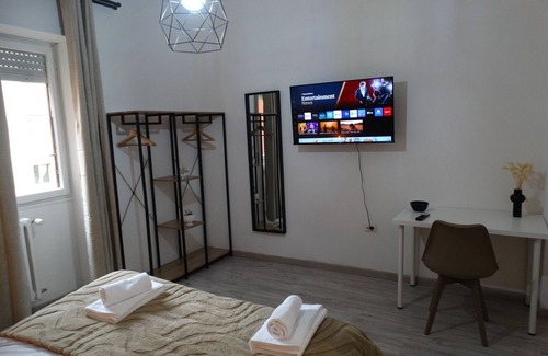 Located in Rome, this cozy 66 sqm apartment can accommodate up to 4 people in 2 versatile bedrooms. You will find a spacious double bedroom and a second twin room, which can be set up with a double bed or two single beds. The apartment features a functional bathroom, fully equipped kitchen, air conditioning, TV, dedicated workspace, washing machine, and fast Wi-Fi—ideal for video calls and remote work.