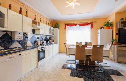 "Gyula", 4-room apartment on the ground floor. Spacious, partly renovated in 2024, comfortable furnishings: open living/dining room with dining table, cable TV, international TV channels and flat screen. Exit to the veranda. 1 large double bedroom with 1 french bed. 2 double bedrooms, each room with 1 french bed. Open kitchen (oven, dishwasher, Gas stove, 4 gas rings, toaster, kettle, microwave, electric coffee machine). Bath/shower, sep. WC. No heating option. Terrace furniture. Facilities: Internet (WiFi). Parking (2 cars). MA23062507