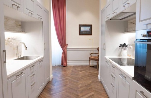 The single-level flat in classical Florentine style (183 sqm) can accommodate up to 10 people and offers 5 bedrooms and 6 full bathrooms.