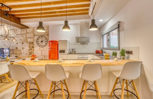 This beautifully renovated apartment located in the heart of Sa Pobla, a vibrant village in northern Mallorca. Perfectly situated near the Plaza Mayor, this charming property offers easy access to all the local amenities, with the added convenience of private parking. The apartment blends rustic charm with modern design, featuring original stone walls and wooden beams that create a warm and inviting atmosphere. Whether visiting in summer or winter, Sa Pobla’s lively weekly market on Sundays offers a great selection of local and artisanal products at affordable prices. Inside, the apartment boasts a spacious and well-appointed living-dining area with an integrated kitchen. Stylish windows fill the room with natural light, while a comfortable chaise lounge and smart TV make the space perfect for relaxing. A large wooden dining table for up to 8 people separates the living area from the fully equipped kitchen. The apartment also includes air conditioning and wifi, ensuring a comfortable stay throughout. It features two double bedrooms, one of which has an en-suite bathroom, as well as a bedroom with a bunk bed, and two additional bathrooms with showers for convenience. For those who love the outdoors, the apartment offers both an interior patio and a roof terrace, both furnished for al fresco relaxation and enjoying the sunny Mallorcan climate. Located just a short drive from the stunning white sandy beaches and turquoise waters of Alcudia and Muro, the apartment provides an ideal base for your Mallorca getaway.