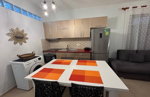 A modern apartment with two bedrooms accommodates up to five guests comfortably. The sleeping arrangements include one king-size bed, two single beds, and a single sofa bed in the living area. This newly built property is air-conditioned and features convenient amenities such as a fireplace, lift, washing machine, dryer, iron, hairdryer, and Wi-Fi. The apartment also includes a garage in the same building and is adapted for disabled guests. Pets are not allowed, and bed linen and towels are included with regular changes. Arrival out of schedule is possible for a small fee. Located just steps from Aquamarina Diamond Hill water park and Perla e Jonit restaurant, the apartment is also close to Market Soni supermarket and multiple beaches including Marina Bay rock beach and Liro rock beach. The popular Plazhi Ri sandy beach lies 800 meters away. The property benefits from easy access to public transport with a bus station 100 meters distant, while Vlora city center is 5 km away. Vlora International Airport is 25 km from the apartment, with Tirana International Airport approximately 157 km away. The open-plan kitchen is equipped with modern induction cooktop, refrigerator, oven, freezer, and toaster, providing all necessary utensils for meal preparation. The living space is enhanced by a TV and a cozy fireplace for cooler evenings. The apartment includes final cleaning services, ensuring a well-maintained and hassle-free stay for guests seeking a family-friendly, seaside retreat.
