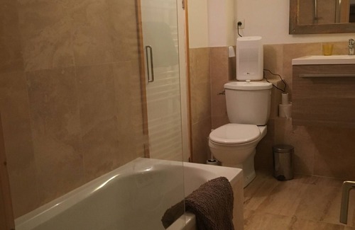 The bathroom has a bath and shower , Wc and sink