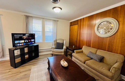 This amazing one-bedroom apartment is centrally located, offering easy access to Highland, Merrillville, Munster, Hammond, Whiting. Situated above a real estate office, it has its own private entrance and free parking . Inside, you’ll find a huge kitchen with a pantry. The bedroom has a queen-sized bed, blackout curtains, and a smart TV. The cozy living room also features a smart TV and comfortable seating. The bathroom offers a large shower . Perfect for modern living and convenience!
