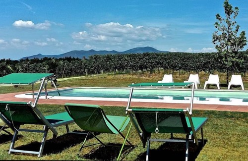 Beautiful, rustic large working farm "Pisa Toscana", surrounded by vineyards. 5 apartments in the property. 5 km from the centre of Pontedera, 3 km from the centre of La Rotta, 25 km from the centre of Pisa, in a secluded, sunny position on a slope, 50 km from the sea, in the countryside. For shared use: natural state property 12 ha with trees, swimming pool (10 x 4 m, depth 120 cm, seasonal availability: 01.Jan. - 31.Dec.). Outdoor shower, patio, terrace, garden furniture, barbecue. In the complex: restaurant, washing machine (for shared use). 650 m long bumpy, narrow motor access (via unmade road). Parking on the premises. Supermarket 4.5 km, restaurant 1.2 km. Please note: the owner lives on the same property. Additional accommodations can be booked.