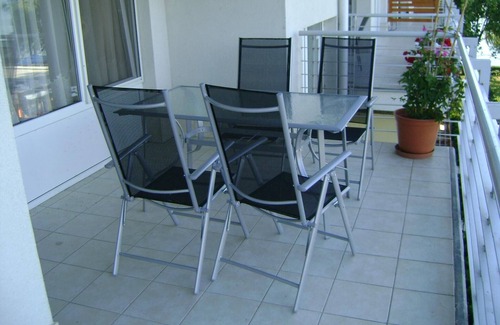 The apartment is located directly at Lake Balaton (next to the free beach area), and has a wonderful view to the lake. It has one bedroom with air-conditioner for 2 people, living room with LCD TV and with air-conditioner for another 2 people with american kitchen for self catering, bathroom with WC, large terrace with garden furniture and deck chairs. Free WIFI internet. The apartement is in the 3rd floor and the building has glass elevator.