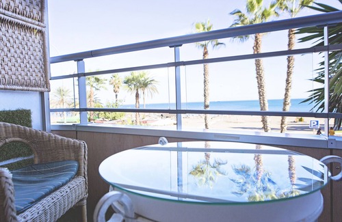 Beachfront. Oceanfront terrace. On Malagueta Beach, next to Muelle Uno and ten minutes from the Historic Center. Very bright and comfortable. Two bedrooms. Flexible arrival times. Air conditioning in the living room and bedrooms, fast Wi-Fi, and an elevator. Master bedroom: Super King bed, sofa bed. Bedroom 2: Two single beds, Bluetooth music tower. Full kitchen: coffee maker, oven, and everything you need for the beach, including beach towels, chairs, and an umbrella.