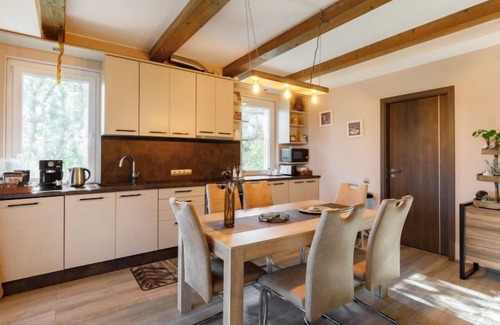 Révfülöp 25 km from Balatonfüred: Modern, beautiful villa, renovated in 2022. In the resort, in a sunny position residential area (villas), 120 m from the lake, 500 m from the beach. For shared use: property 1'800 m2 (fenced), beautiful garden to relax. Private: outdoor shower, garden furniture, barbecue. In the house: table tennis, central heating system. Parking (for 3 cars). Grocery 900 m, supermarket 1 km, restaurant, bar, café 700 m, pedestrian zone 700 m, bicycle rental 1.1 km, railway station 1 km, grass beach 500 m, 500 m, thermal baths "Hévíz" 43 km. Golf course (18 hole) 18 km, tennis 6 km, riding stable 2 km, sports centre 2 km, children's playground 500 m. Nearby attractions: Tihany Abbey 26 km, Annagora Aquapark 27 km, Veszprem Zoo 43 km, Festetics Palace 37 km, Tapolca Lake Cave 17 km. Hiking paths: Badacsony 13 km. In Balatonfüred, 28 km.