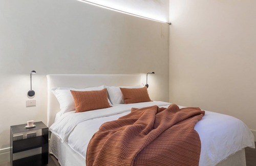Grisaldi del Taja is an apartment that overlooks the well-known Via dei Montanini, a street with many historic buildings in the city of Siena. The Grisaldi del Taja family, from whom the apartment takes its name, owned the entire building and, in fact, their family crest is positioned outside. The interior decorative style blends an ultra-modern design with the frescoed ceilings of two rooms and the marble cladding around the door frames. Elegance and refinement render cosy and welcoming this apartment in the historic centre of Siena. The custom-designed kitchen is unique and refined. Covered in marble, it has motor-powered drawers with a push-pull system and is skilfully lit from above. The large windows in the living area overlook Via dei Montanini. Another peculiarity is the acoustic insulation from the street in the city centre which, with the windows closed, renders the environment silent. The double bedroom, at the rear of the building, has a king-size bed. The centrality of the apartment allows you to enjoy the historic heart of the city and its social life, pampered by the charm and design of this home.