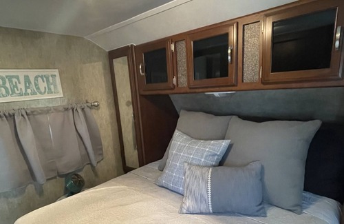 This tiny home has so much to offer for such a “tiny” package. Cozy up in our Queen bed, dressed with luxury bedding for optimal comfort. Bonus futon, perfect for the kids or your furry friends! Fully stocked kitchen, ready to accommodate your best home-cooked meals. Banquette style seating, ideal for family game nights (games provided)! Fire up the Smart TV to stream your favorite shows and movies through Netflix, Amazon, Hulu & so much more. Step outside into your personal paradise and kick your feet up in mini cabana, featuring laid-back seating, citronella candles and comfy throws pillows. Grill up some burgers and get ready to enjoy under the string lights and glistening solar lanterns at our high top bar table. Enjoy some sun in our fun beanbag chairs!