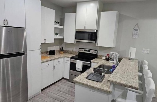 Enjoy the comfort of home in this fully equipped apartment, designed with all the amenities you need for a comfortable stay. This features a full size kitchen , 2 private bedrooms, and 2 full bathrooms. You'll have plenty of space to relax with a total of 3 beds , including 1 king bed in one room and 2 queen beds in the other both with 40 inch TVs. Also we provide 2 parking spaces with carport covering, and a 55-inch TV in the living room for entertainment. Whether you're here for business or pleasure this apartment is the perfect space for your stay.
