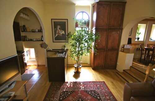 A few steps off the lift, pass through your small gated patio and enter 50 square meters of homelike comfort: full American kitchen, cable TV, wi-fi high speed internet, en suite separate water closet and bath with custom-built shower. Apartment Sarah is actually two adjoining, air conditioned, rooftop apartments on the south side of the building (Sarah on the east, Belle on the west). Overlooking a lovely and bright courtyard and away from the bustle of the city center just outside (two 5-star hotels are within 2 blocks of the front door; Budapest's oldest and most extensive music and record shop is on the ground floor of the building), Apartment Sarah/Belle has a cathedral ceiling more than 4 meters high, with nooks and crannies and skylights that render it romantic and unique.