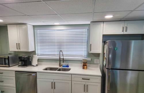 The main level features an inviting open-concept, complete with a newly remodeled kitchen stocked with cookware essentials to prepare your favorite meals. The spacious living area offers plenty of seating, creating a cozy space to unwind after a day in the sun. Stay connected with high speed WiFi, and enjoy the added convenience of an in-unit washer and dryer. A full bathroom with a tub/shower combo rounds out this level, ensuring ease for all guests.